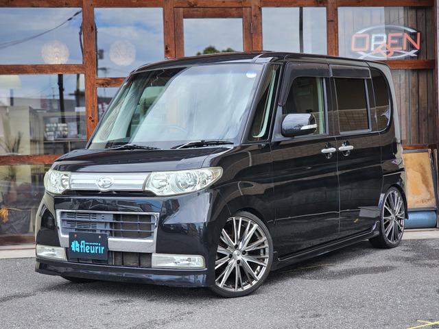 ダイハツ タントカスタムのご紹介です。平成22年式のブラックの軽自動車で、スタイリッシュなローダウンと社外17インチアルミホイールが際立ちます。装備が充実しており、ABS、トラクションコントロール、横滑り防止装置、盗難防止装置、ETC搭載で安心です。タバコ臭もなく、クリーンな環境で快適なドライブをお楽しみいただけます。この機会にぜひご検討ください。