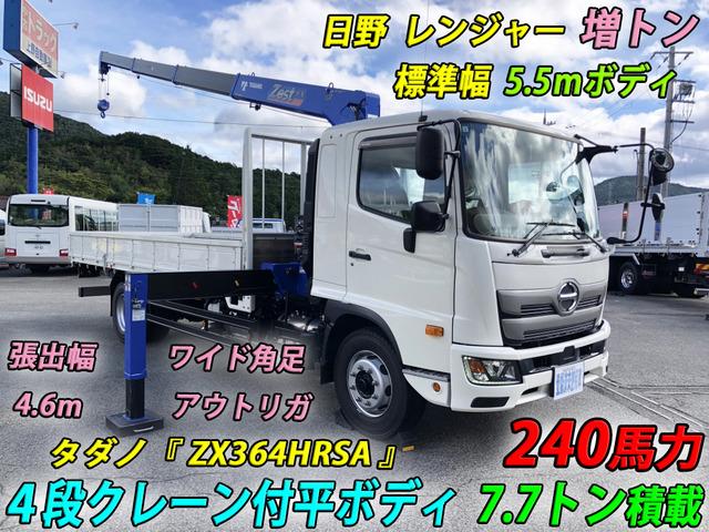 ★管理番号:L-04649 増トン! 日野 レンジャー 4段クレーン付 平ボディ 7.7トン積載 タダノ ZX364 液晶ラジコン 木製あおり3方開 標準幅 ベッド付 登録済未使用車
